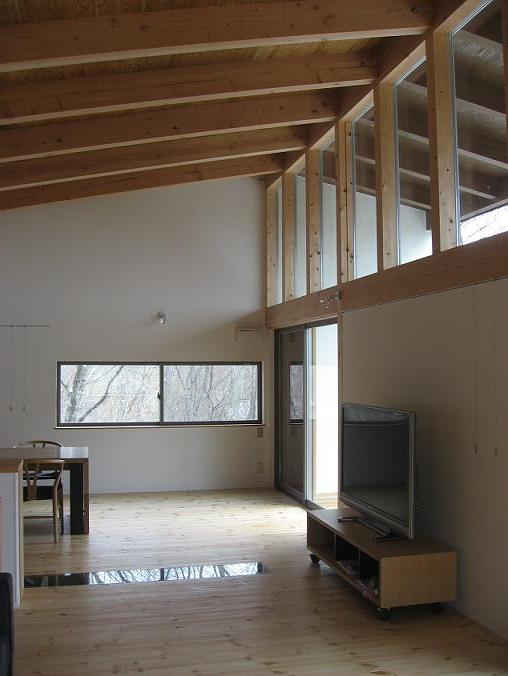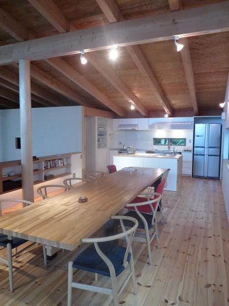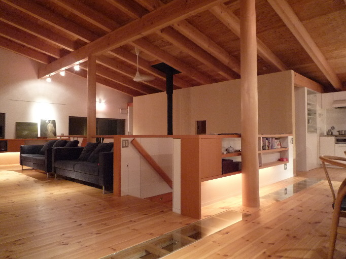 土間は薪ストーブを中心に多目的に利用できる落ち着いた空間として設け、2階はたくさんの友人を招いてゆったりと楽しく過ごせるオープンな空間となっています。新たな「土間空間」のあり方を追求した家でもあります。