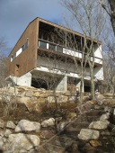 当面は週末住宅として住まい、将来はこの地に永住するというクライアントの希望を踏まえた住宅です。外観は国立公園内の基準により制限され、屋根は茶系色のフッ素樹脂塗装ガルバリウム鋼板、外壁は杉板張りとなっています。